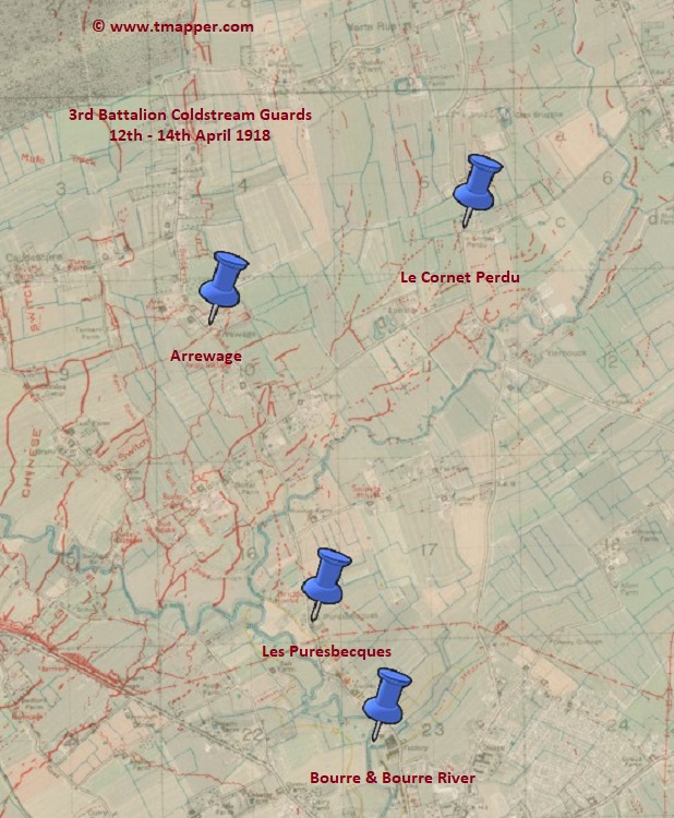 It is not known on which day George was wounded but on the 12th & 13th April the battalion had attacked enemy positions in the area of L'Apinette, Arrewage, Le Cornet Perdu, Les Puresbecques and La Bourre River. There was heavy fighting and it appears that not much progress was made and on the night of the 13th what was left of the battalion consolidated a line in an orchard to the east of Arrewage.Over the two days 161 men were wounded, 31 killed and 268 were missing. The following day the Battalion withdrew to Bourre during which time 13 men were wounded. William died in the 39th Stationary Hospital, Aire sur la Lys. He had arrived in France on 22 Dec 1914.