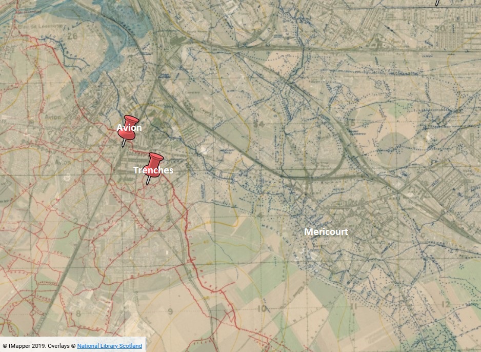 On the 23rd April the 15th Battalion moved into position to relieve the 16th Battalion RWR in Chaudiere, Cyril and other nearby trenches (see below) just SE of Avion and NW of Mericourt. The relief was completed by 1.30am on the 24th. During the day the trenches were subject to the normal low levels of sniper and machine gun fire. Cecil was one of 5 men killed that day at the end of which the battalion was relieved by the 38th Canadian Battalion and the 15th made its way to camp at Villers au Bois without any further casualties.![]() |