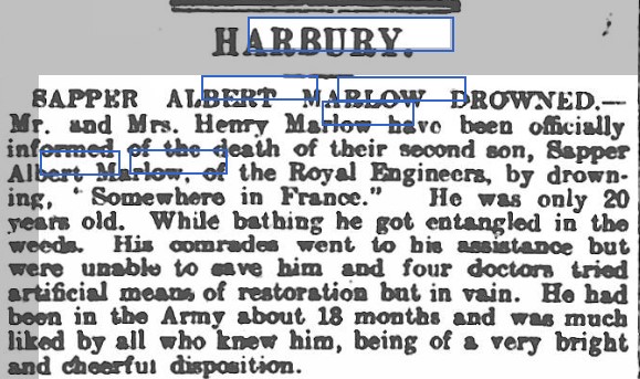 A report in the Coventry Herald on 11 Aug 1916 states that Albert had died by drownging "while bathing he became entangled in the weeds. His comrades went to his assistance but were unable to save him and four doctors tried artificial means of restoration but in vain".On the day he drowned the 110th Railway Company were building a new railway siding at Ancre Junction, Meaulte which is on the Ancre River.