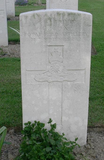 George is listed as dying of his wounds on 2 Sep 1917. He is buried at Bleuet Farm Cemetery. Bleuet Farm was home to a Dressing Station put in place in prepartion for the Third Battle of Ypres. As George died at a Dressing Station it is likely that he died soon after he wounded and before he could be evacuated to a Casualty Clearing Station or Hospital. (Click here for more on the Evacution Chain for the Third Battle of Ypres). The war diary for the 1st and 2nd September 1917 is transcribed below. The diary does not appear to contain any references to Casualties so does not help identify a specific day that George was wounded, although it does mention the destruction of a gun belonging to D Battery on the 1st Sept. Bridgade HQ at Map Reference [Ypres] 28.B.11.a.5.7 which was just SW of Boezinge and just north of Bleuet Farm. 1.9.1917: During the night a gun of D/75 was completely demolished by 8" or 11" shell. 7am: All batteries carried out concentrated shoot at intense rates on shell holes in area U.17.b.75.45 - U.17.d.50.95 - U.17.c.05.20 = U.17.b.25.45 (Sheet 20) from 7am to 7.2am and 7.15am to 7.17am. [Click here to plot] 11am to noon: Dugouts at U.10.c.89.19 the Mill at U.10.d.38.95 and the Huts at U.11.d.00.46 were kept under fire from 11am to noon during heavy bombardment of these targets. 1pm: From 1pm to 2pm a concentrated shoot of all batteries took place on shell hole area 75 yards N&S of line U.17.a.40.75 – U.17.a.0.8. F Group Headquarters moved to 28/B.11.a.5.7 during the morning. Light bad for observation during day. 2.9.17 - 8am: Owing to weather aeroplane shoot arranged D/75 did not materialize. A concentrated shoot of all guns in left Artillery took place from 8am to 8.2am and from 8.45am to 8.47am on shell hole area U.17.a.30.95 – U.11.c.3.2 – U.16.b.9.9. 5pm: From 5 to 5.2pm 75th Brigade shot on hostile battery at U.10.a.78.57 and in cooperation with heavy artillery all guns fired 3 rounds of gun fire on U.17.d.7.5 – U.18.c.4.6 and copse at U.24.d.5.9 at 3.50pm, 4.10pm and 6pm respectively. END |