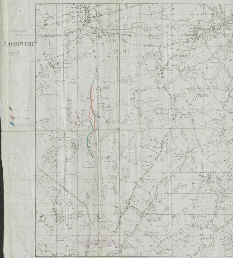 Battalion reached La Cornet Malo at 2.30am. G.O.C 153rd Inf Bde ordered preparation for counter-attack on approximate front R.15.central – R.21.c.9.6 with possible alternative of holding a defensive position from Q.23.d central (Pacaut) to Q.35.d central. The situation at that time was not sufficiently clear to enable reconnaissance to be made. Battalion concentrated in Q.28.d central with HQ at Q.29.c.0.3 ready for counter-attack if ordered.