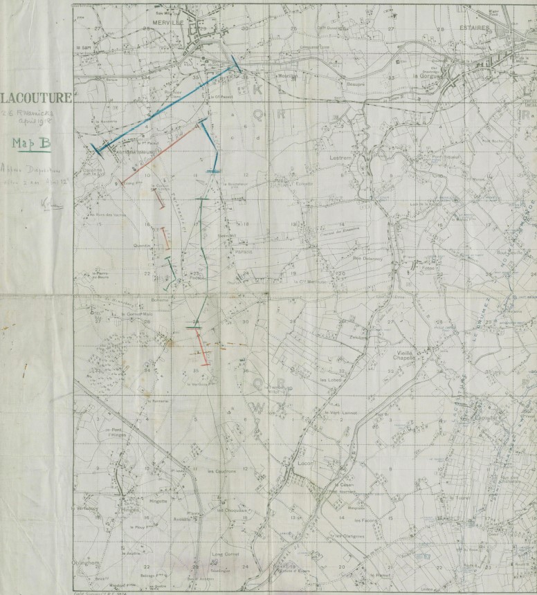 Disposition about 2am on 12th April were as shown on Map B. Patrols were out on Battalion front but did not return. About 6am on 12th I drew attention of 153rd Brigade to the extended front held by the Battalion and the weakness of the defensive dispositions of the right flank.