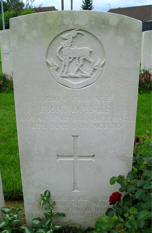 Eric is listed as being killed in action on 8th May 1918. The 10th battalion war diary entries for the 7th & 8th May are transcribed below: Front Lines - Vlamertinghe - 7 May 1918: In the evening B & D Coys worked on a line of slits from H.14.c.9.0 to H.20.c.0.8 under orders of 81st Field Coy R.E. from 9pm to 12 midnight. Front Lines - Vlamertinghe - 8 May 1918: The day was quiet. Throughout the night a 4.5" How Battery 50 yards west of the Farm House occupied by Battn HQ was intermittently shelled with H.E and Gas. At. 3.15am a heavy are shoot commenced on battery positions in H.20.C & A and H.14.c developed into a heavy gas bombardment, 8" gas shells were chiefly employed. One of the first shells landed in a barn occupied by Bn HQ and D Coy which caused a large number of casualties, in which Lt Lander and 2/Lt Lt Richards were included (the only officers there were in D Coy). Only 2 men were killed all the other casualties were wounded and gassed. The heavy shelling ceased at 4.30am but was resumed at intervals during the day. At 9.00am the Bttn HQ moved to a short line of trench 100 yards east of farm where they were just outside the area shot at. B Coy which was on slits east of MILLEKAPELLEKEN Farm H.19.G..9.0 also suffered casualties and had to move their Coy HQ to 120 yards east of Farm House. Total casualties to noon on the 8th:- Killed 2 OR (including Eric). Wounded Lt Lander, Lt Oakley; 2/Lt Richards and 48 OR. |