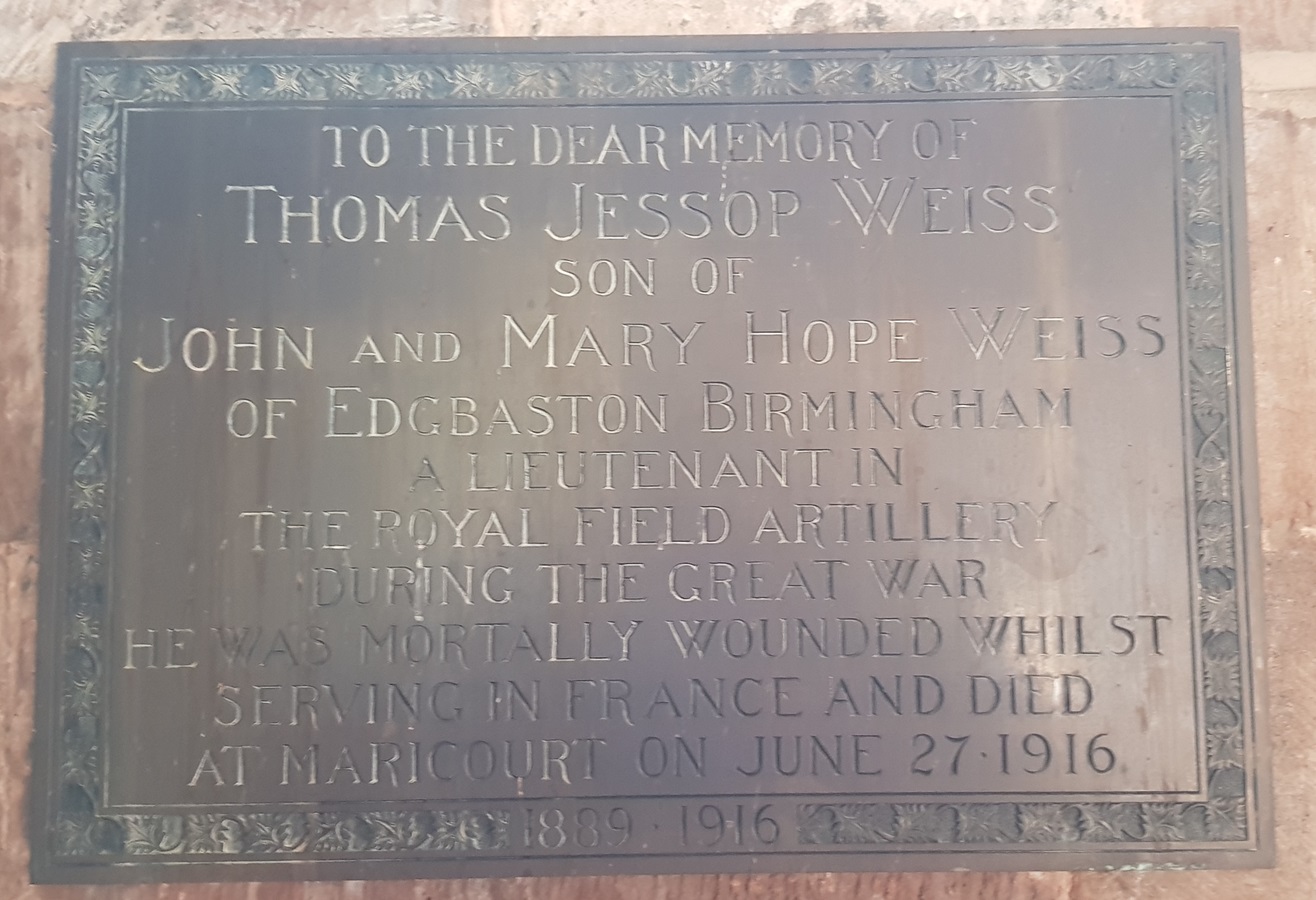 "ROLL OF HONOUR - The Rector [of Berkswell] writing in the Parish Magazine says : We have to record another killed in action from Berkswell, Lieut Thomas Weiss of Mount Pleasant. He received his commission early in the war [13 Oct 1914] and was Gazetted to the Artillery. He was serving with a Howitzer battery when he met his death.