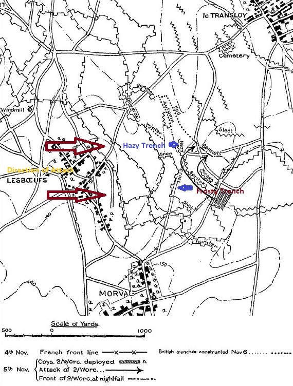 It is clear from the daily list of casualties that William was wounded on the 23 Oct 1916 during an attack by the 1st Bn on enenmy lines on La Transloy Ridge. The formed up the night before in Shamrock and Fluffy trenches east of Les Boeufs. On the day the 1st Bn advanced in support of the Royal Dublin Fusiliers. The attack was delayed by fog till 1.30 in the afternoon; in both battalions the casualties were heavy, and at evening in small isolated parties they were digging in near Frosty and Hazy Trenches. They held on during the night, and on the following day gradually consolidated their gains, till at evening they were relieved. The Royal Warwickshire again lost heavily, 2 officers killed and 156 other casualties. The capture of Frosty Trench was important as a step to a future advance. But the 4th Division was now again withdrawn for a needed rest.