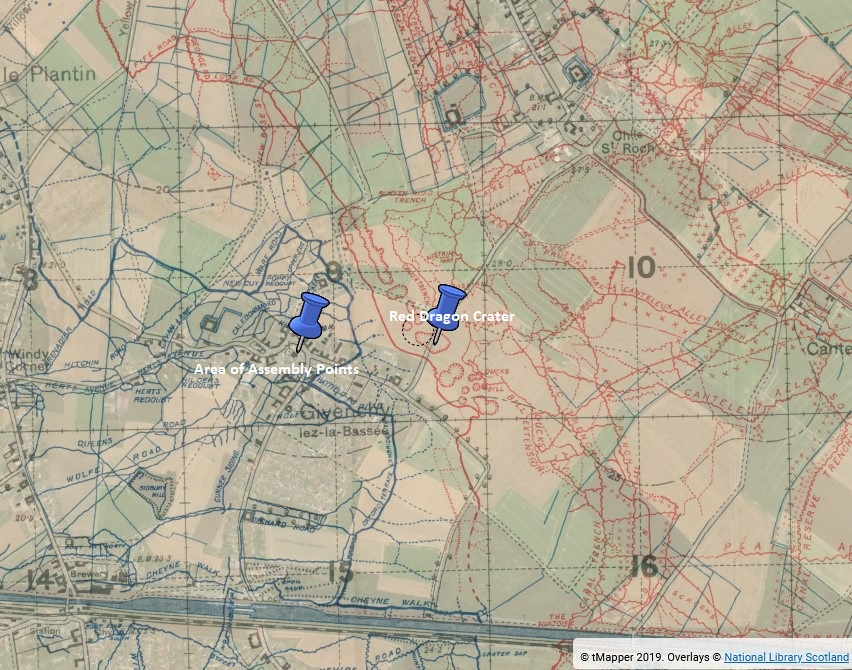 On the day he died the battalion were in the Givenchy trenches when they ordered to capture the high ground NW of Givenchy-les-la-Bassee near Red Dragon Crater, unfortunately the war diary is not more specificabout locations and does not give map references or many place names. The diary states that the attack started at 4.45am just as dawn was breaking and all objectives had been captured by 5.50 am.