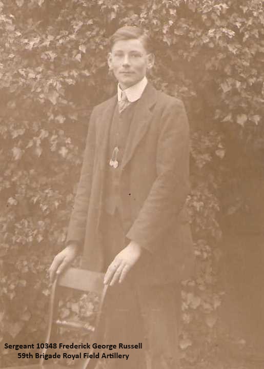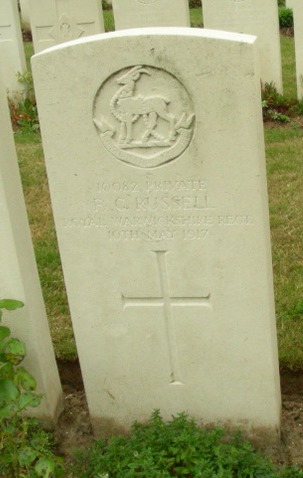 Frederick is listed as being killed in action on 10 Aug 1917. The War Dairy held by the National Archive does not contain the July, August and September 1917 pages however an ever helpful user at The Great War forum pointed us to the Ogilvy Muster, an archive of records held by various museums, and the war diary for 10 Aug 1917 is transcribed below, however no mention is made of any casualties. Date of death the two CWGC grave registration records give conflicting dates of death with one quoting 9 Aug 1917 and the other 10 Aug 1917 and therefore both dates are transcribed. Chateau des Trois Tours - August 9th: Harrassing fire carried out during 24 hours by B, C & D/59. END Chateau des Trois Tours - August 10th: At 4.35am II Corps attack to capture original Black Line - this brigade cooperated with object of deceiving enemy a feint barrage being put on Brigade Zone. C Battery to rest. A in action again at 12 noon. Harrassing fire carried our during 24 hours. END A brief article in the Leamington Spa Courier on 27 Sep 1917 reads "Sergt. Fred Russell, R.F.A., was killed action on August 10th (instantly)" (Thank you to Michael at the Great War Forum) |