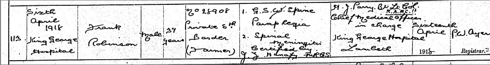 Frank died of a gun shot wound to the spine and spinal meningitis on the 6th April 1918 at the King George's War Hospital in Lambeth. We have found an index record showing that Frank was admitted to a Military Hospital on 22 Mar 1918 with Gun Shot wounds but we cannot confirm it was King George's. Please find below the death certicate record from the General Register Office (GRO). We have not yet established when or where Frank was wounded.