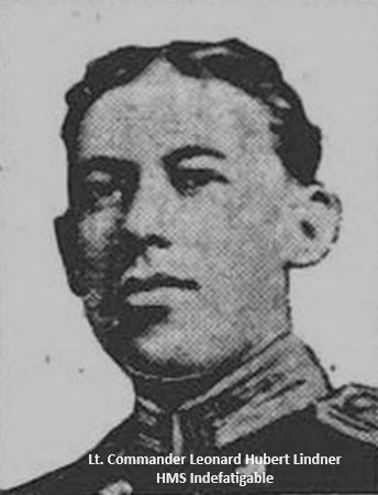 Leonard was killed in action on 31 May 1916 during the Battle of Jutland, one of the 1016 crew members who died when Leonard's ship, HMS Indefatigable was sink by German shell fire. HMS Indefatigable was sunk in the "Run to the South" during the Battle of Jutland as Beatty changed course to steer east south-east at 15:45, paralleling Hipper's course, now that the range closed to under 18,000 yards (16,000 m). The Germans opened fire first at 15:48, followed by the British. The British ships were still in the process of making their turn as only the two leading ships, Lion and Princess Royal, had steadied on their course when the Germans opened fire. The British formation was echeloned to the right with Indefatigable in the rear and furthest to the west, and New Zealand ahead of her and slightly further east. The German fire was accurate from the beginning, but the British overestimated the range as the German ships blended into the haze. Indefatigable aimed at Von der Tann and New Zealand targeted Moltke while remaining unengaged herself. By 15:54, the range was down to 12,900 yards (11,800 m) and Beatty ordered a course change two points to starboard to open up the range at 15:57. Around 16:00, Indefatigable was hit around the rear turret by two or three shells from Von der Tann. She fell out of formation to starboard and started sinking towards the stern and listing to port. Her magazines exploded at 16:03 after more hits, one on the forecastle and another on the forward turret. Smoke and flames gushed from the forward part of the ship and large pieces were thrown 200 feet (61.0 m) into the air. It has been thought that the most likely cause of her loss was a deflagration or low-order explosion in 'X' magazine that blew out her bottom and severed the steering control shafts, followed by the explosion of her forward magazines from the second volley. More recent archaeological evidence shows that the ship was actually blown in half within the opening minutes of the engagement with Von der Tann which fired only fifty-two 28 cm (11 in) shells at Indefatigable before the fore part of the ship also exploded. Of her crew of 1,019, only three survived. While still in the water, two survivors, Able Seaman Frederick Arthur Gordon Elliott and Leading Signalman Charles Farmer, found Indefatigable's captain, C.F. Sowerby, who was badly wounded. Elliott and Farmer were later rescued by the German torpedo boat S16, but by then Sowerby had died of his injuries. A third survivor, Signalman John Bowyer, was picked up by another unknown German ship. He was incorrectly reported as a crew member from Nestor in The Times on 24 June 1916. |