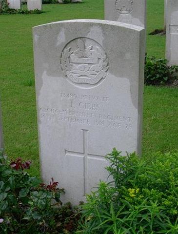 John is listed as dying of wounds on 16th September 1918. The war diary and a newspaper report reveals that he was wounded on 15th Sept 1915 during the attack on Maissemy Ridge. The Battalion war diary entry and the newspaper report are transcribed below. War DiaryVilleveque & Marteville - Sept 15th 1918: At 5.30am A,B and C Companies attacked made under an artillery barrage with a view to gaining the high ground in R 30 and R 36. All objectives were gained, many of the enemy were killed and 9 prisoners and 10 machine guns captured. Throughout the day enemy snipers were very active and caused many casualties. Casualties for the day. Wounded Lieut E. Richardson C Coy; 2/Lt W.H. Lamberrt A Coy; Lieut G.E. Birkett MC RAMC all wounded. 13 other ranks killed and 47 wounded. The Corps Commander Lieut Gen Sir W. Braithewaite KCB Comdg IX Corps wired congratulations on capture of some very important ground. The Battalion was relieved by Loyal North Lancs, 1st Inf Bde and moved into Brigade Reserve near Vermand. Newspaper ReportThe Stratford-upon-Avon Herald - Friday October 4th 1918 Private John Gibbs, of the 1st Gloucesters, aged 27, was the elder son of Mrs John Gibbs, whose husband, a much-respected inhabitant of Upper Quinton, only died last October after a long illness. Private Gibbs who wounded in action on September 15th and died in hospital the following day without gaining consciousness, was greatly valued in the army, officers and men alike testifying to the fact that he was brave and capable soldier and a good comrade, distinguished by straightness, high principle, and conscientious discharge of duty. |