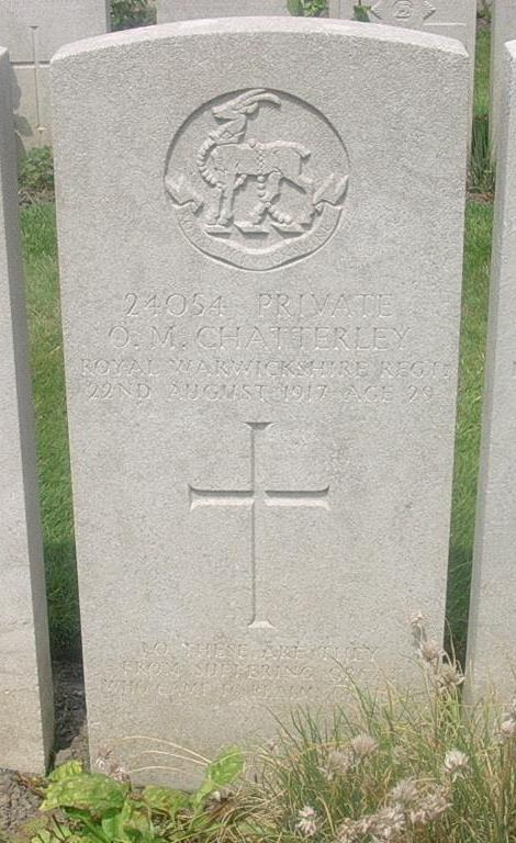 Oscar is listed in two military records as having died of wounds incurred in action on 22 Aug 1917. It appears from the war diary that he was the one "other rank" wounded on the 21 Aug 1917 during training at Area 1 at Brandhoek, Ypres. The battalion war diaries for 21st & 22nd are transcribed below. B Camp - Brandhoek - No 1 Area - 1917-Aug-21: 3am. 1 officer and 50 reserve S.B's [Stretcher Bearers] to Main Corps Dressing Station, Wieltje Mines Dugouts. 15 officers and 10 Platoon Sgts proceeded to demonstration in attacking Strong Points at place 10 miles NW of St. Omer. 2 Coys fired on 25 yard range and 3 Coys bathed at Corps Baths, Poperinghe. All Company's taken over model constructed under Battn arrangements of German Lines - objectives in next attack. Weather Fine, some shelling in neighbourhood Casualties 1 OR wounded 5.30pm C.O. attended Bde Conference. END B Camp - Brandhoek - No 1 Area - 1917-Aug-22: Companuy training. 6am 1 officer and Emergency S.B's to Corps Walking Wound Station. 2 Lt Whiteley and 2 OR to Anti Aircraft L.G. [Lewis Gun] Course at 25 Squadron RFC. Col held conference of Coy Commanders. All Coys went over model of German Lines. END |