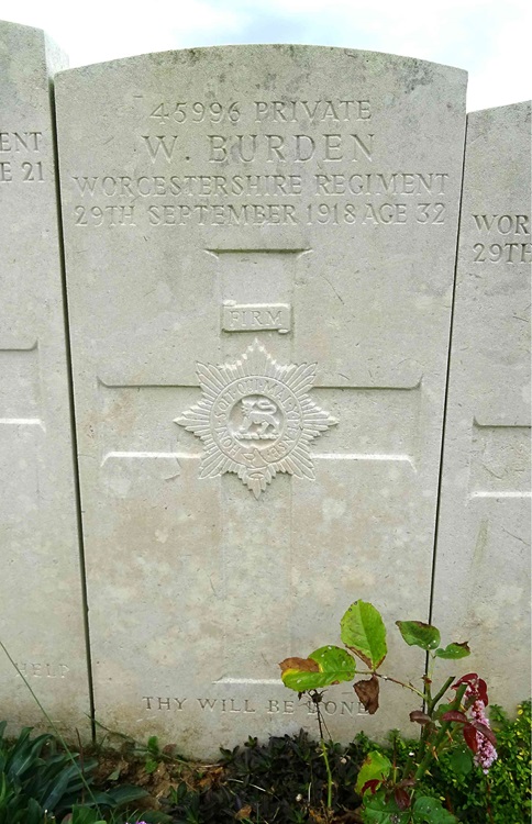 William is listed as being killed in action on 29 Sep 1918 duing The Battle of the St. Quentin Canal. The following narrative of the battle is provided courtesy of excellent The Worcestershire Regiment website. Preparation and Orders for the AttackThe 12th and 18th Divisions were to attack Vendhuille, while further north the IVth and Vth Corps of the Third Army made a subsidiary attack from Epehy to Marcoing. On the right of that latter attack the 33rd Division was to advance from the height of Epehy to gain the German forward positions west of the Canal. On the left flank of the 33rd Division the 98th Brigade were to storm Villers Guislain: on the Division's right flank the 100th Brigade, including the 2nd Worcestershire, were to attack down the Targelle valley towards Ossus. That attack, as we have said, was subsidiary to the main operation, and could not be expected by itself to achieve any great success: consequently, since there were not enough tanks and artillery to assist adequately the whole front of attack, all the tanks and most of the available guns had to be concentrated behind the main attack further south, leaving only inadequate support on the front of the 33rd Division. The attack of the 33rd Division was supported only by the 33rd Divisional Field Artillery—two Field Brigades, without any addition of heavier pieces. In contrast, the decisive attack on the right was supported by 44 Field Brigades and 21 Brigades of medium or heavy artillery, and was assisted by a strong force of tanks. Also the subsidiary attack was to be started earlier than the main attack in order to deceive the enemy and to engage the fire of the German guns. That latter provision entailed an especial disadvantage for the 2nd Worcestershire; for the Battalion formed the extreme right flank of the subsidiary attack, and consequently the Worcestershire companies would have to advance with their right exposed to enfilade fire from Lark Spur until the subsequent movement of the 12th Division further to the right. The task thus set to the 33rd Division was so formidable that the Brigadier of the 100th Brigade, Brigadier-General A. W. F. Baird, reported (To the B.G.G.S. Vth Corps on the afternoon of September 28th) officially that in his opinion success could not be expected unless the attack was assisted either by tanks or by more artillery, or unless the enemy's machine-guns were effectively blinded by a heavy curtain of smoke. But his remonstrance was unavailing. It was essential to secure the success of the decisive attack further south; and neither guns nor tanks were sufficiently numerous to be spared. The orders must stand. Through the night the support companies of the 2nd Worcestershire filed forward to the front, and before dawn the Battalion was deployed for attack. In the front line, "Limerick Trench," from right to left were ‘D’ and ‘C’ Companies; in the second line behind them were ‘A’ and ‘B’ Companies. The two leading companies were to capture the sunken "Gloster Road"; then the two supporting companies would pass through and take "Pigeon Trench" beyond. The Battle of the St. Quentin CanalAt 5.30 a.m. the guns behind the 33rd Division (The main attack on the right opened twenty minutes later) opened fire and the battle began. Scrambling out of their trenches the Worcestershire platoons (The two leading companies advanced in deep formation; two platoons in front line, one in support, one in reserve. The front line platoons were in extended order) advanced as rapidly as possible through a storm of German shells; but the rain of the previous days had converted the shattered ground into deep mud, and the laden troops could not keep up with the barrage. The British shrapnel burst for a few minutes along the line of the sunken " Gloster Road " and then moved on down the valley. As soon as the shells ceased to burst over the road the German machine-guns came into action one after another (In all, 7 machine-guns appear to have opened fire from the sunken road and from, the Cross-Roads). From the cutting in front and from the Cross-Roads to the right came the hard stammer of their firing, and under the hail of their bullets the attack withered away. Through the smoke of the shell-bursts the platoons in rear saw their comrades in front collapse, but they pushed on in their turn only to meet a like fate. All the platoons of the two leading companies had been shot down and the majority of the two support companies had fallen before the survivors came to a halt half-way to the road and took cover as best they could. It was not possible to send a message back across that open ground swept by machine-gun fire, and it was not until after 10.0 a.m. that it could definitely be reported that the attack had failed. About that time a merciful mist drifted down and veiled the battle-field. Under cover of that mist the survivors of the attack regained Limerick Trench. German shells were still raining down all around, and a tremendous thunder of gunfire on the right flank told them that the main attack had been opened along the whole front of the Fourth Army. Throughout the rest of that day shells and bullets struck around the trenches which the survivors of the Battalion were holding. Orders for a further attack were followed by counter orders; and the position was unchanged when darkness fell. That night came cheering news. The great attack on the right had been successful. The Bellicourt defences had been stormed, the St. Quentin Canal had been crossed, and the Hindenburg Line was broken. The fall of the main defences further south entailed the retreat of the enemy in front. Patrols were sent forward before the dawn. They found the sunken road empty save for a few dead. Cautiously they made their way down the valley, reconnoitred "Pigeon Trench" and found it deserted, then pushed on to the bank of the canal beyond. Machine-guns spat at them from the eastern bank; but Ossus and all the ground we
