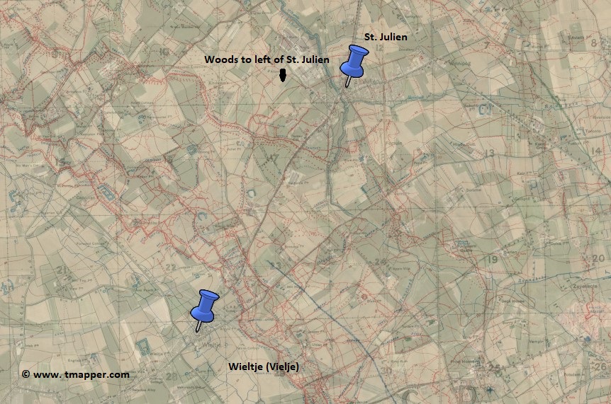 25th April 1915 - Vielje: Left Ypres at 12mn for Vielje where orders were received for the attack. The brigade attacked at 4.30am. We attacked the wood on the left of the line with 7th A&S Highlanders in support. The Seaforth Highlanders, R Irish Fus and R Dublin Fus attacked on our right on St. Julien. Owing to the German Trenches being insufficiently shelled and supports unable to come up the line retired at about 7am to trenches near the farm and consolidated our position. Our casualties were very heavy 17 officers and 500 other ranks killed, wounded and missing.