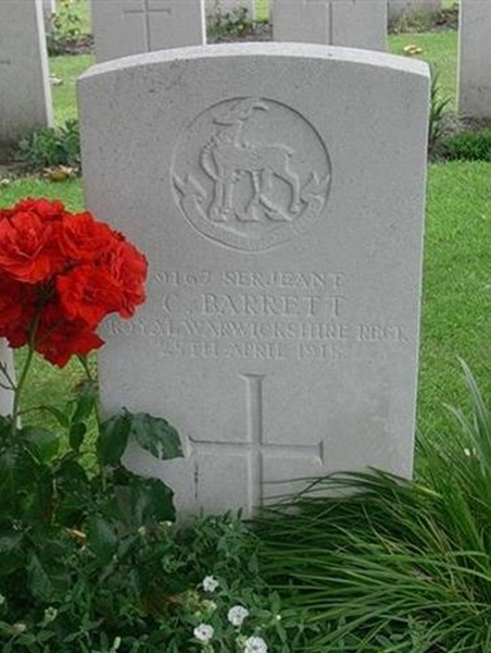 ANOTHER SHIPSTON MAN KILLED - Official notification has now been received of the death of Sergeant Charles Barrett of the 1st Battalion Royal Warwickshire Regiment, who was shot through the head in action at St. Julien on Sunday, April 25th. The deceased leaves a widow and two children [see below].