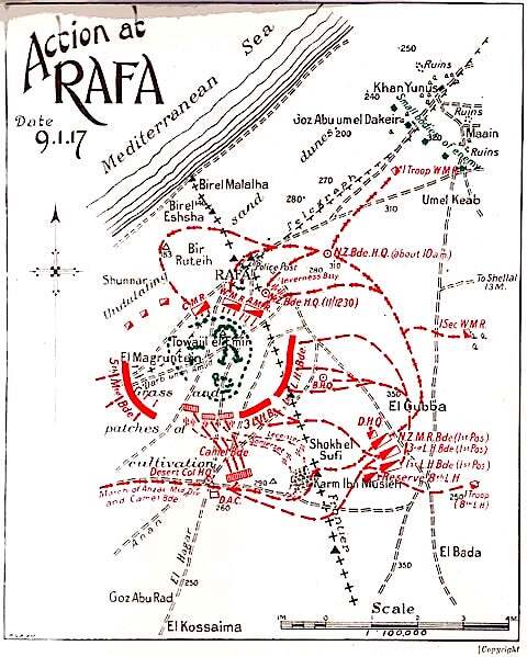 Circumstances of DeathHarry is listed as being killed in action on the 9 Jan 1917 durint the Battle of Rafa. An extract from the Hon. H.A. Adderley's book The Warwickshire Yeomanry in the Great War is transcribed below along with a report by Daily Telegraph War Correrespondent William Thomas Massey. Also below is a map from the Action at Rafa courtesy of the Warwickshire Yeomanry Museum Extract from H.A. AdderleyAt 4pm on 8 January 1917 the 5th Mounted Brigade marched eastward from El Arish with the Desert Mounted Column, including the Anzac Mounted Division and the Camel Corps to attack the entrenched position held by the enemy at a point west of Rafa (Rafah). The Brigade acted as advance guard and camped for the night at Sheik Zowaid. The in half Squadrons extended, moved down the Rafa Road at the trot with the Gloucestershire Yeomanry on its left flank across 2.5 miles of open plain commanded by the Turkish redoubt, being forced to dismount for action within 2,000 yards of the foot of the redoubt. Meanwhile the New Zealand Mounted Division made an enveloping attack from the east, the Australians and Camel Corps from the Southeast and South. The Yeomanry were ordered to attack from the West. Large bodies of Light Horse and Yeomanry galloped into action supported by artillery. At 1am on the 9 January the Warwickshire Yeomanry continued the advance towards the Turkish entrenchments as the enemy slept. At 10.30 the attack seemed to be developing and the Gloucesters with four machine guns advanced followed by the Warwicks all being mounted and ready to move within five minutes. The Regiment in column of half squadrons extended, moved down the Rafa Road at the trot with the Gloucesters on its left flank and thence over the bare stretch of open plain commanded for 2 miles by the main Turkish redoubt. Owing to the open country west of the ridge occupied by the Turks the Regiment soon came under a heavy fire and the Warwickshire Yeomanry compelled to dismount for action. A line was taken up facing a downward slope of about 2,000 yards to the foot of the hill containing the front line of the enemy trenches. A steady shell fire caused some casualties among the led horses but owing to the sections being widely distributed there was no loss of men. In the meantime the rest of the Brigade came into position and Headquarters were established in a small redoubt to the left rear which had been previously occupied by the enemy the day before showing how the attack had come as a complete surprise. At 11.45 the Camel Corps on the extreme right were meeting with severe opposition in their encircling movement and C Squadron were ordered to support them on their left flank This advance was carried out under a heavy enfilading fire and the squadron suffered some casualties The object of the frontal attack, which was now developing, was to hold the enemy in front while the enveloping movement to the SE of his position was being carried out by the New Zealanders and the Camel Corps. At 12.45 there was a pause to allow the Camel Corps to link up with the left flank of the 5th Mounted Brigade. The Brigade were at this time disposed as follows: on the left the Gloucesters with one Squadron of Worcesters in the centre the Warwicks D Squadron, Capt Gooch and B Squadron Capt Valintine, C Squadron under Capt Pemberton was on the right front and his right flank. A troop under Lieut King eventually gained its objective under cover of a small knoll. Although the enemy had withdrawn his field guns to the rear the advance was checked by severe traverse fire from machine guns and rifle fire and the Regiment had suffered many casualties though mostly in wounded. About 3 o clock the Warwicks machine gun section under Capt Coulston came into position and opened fire at 1,450 yards on the Turkish front line trenches under cover of which a concentrated attack was carried out. The Gloucesters with C Squadron of the Warwicks came in for heavy fire advancing over open ground and suffered severely. About 4.30 the Camel Corps stormed at the point of the bayonet and were well supported by the Yeomanry machine guns Col Cheape with B and D Squadrons then advanced across the ploughed area on the enemy's central position but at 800 yards from their front trench he received orders to withdraw to his horses. It was then nearly dark but a successful and orderly retirement was carried out under effective covering fire. It was left to the Anzacs to complete the victory The other two squadrons which had been sent to reinforce the Worcesters and Gloucesters rallied with the whole Brigade at Sheik Zowaiid at 1 am on the 10th and returned to El Arish arriving at 6 am having marched 60 miles in 36 hours and fought an infantry action from 8 am to 5 pm on the 9th. The net result of the operations was the capture of 2,000 prisoners and a large amount of stores and ammunition. The Warwickshire Yeomanry War Diary records casualties for 9th January 1917 as follows: 2 Officers wounded, 3 ORS killed in action, 36 ORs wounded of which 2 subsequently died of their wounds, 6 horses killed, and 45 horses wounded. Report by W.T. MasseyWilliam Thomas Massey, Daily Telegraph War Correspondent in his description of the Battle of Rafa wrote: The Desert Column's victory at Rafa was one of the finest achieve ments of the war in Egypt By a swift 30 miles night march the mounted troops got well within striking distance while the enemy slept But although entirely surprised the garrison was not unprepared and they were strongly entrenched about two miles south west of Rafa At sunset on the 8th the Australian and New Zealand Mounted Divisions the Camel Corps and Yeomanry and Horse Batteries marched eastwards across country On reaching a point a few miles south of Rafa at about 4 am on the 9th the New Zealanders at daylight made an enveloping attack from the east the Australians and Camel Corps from the south east and south The Yeomanry were ordered to attack from the wes