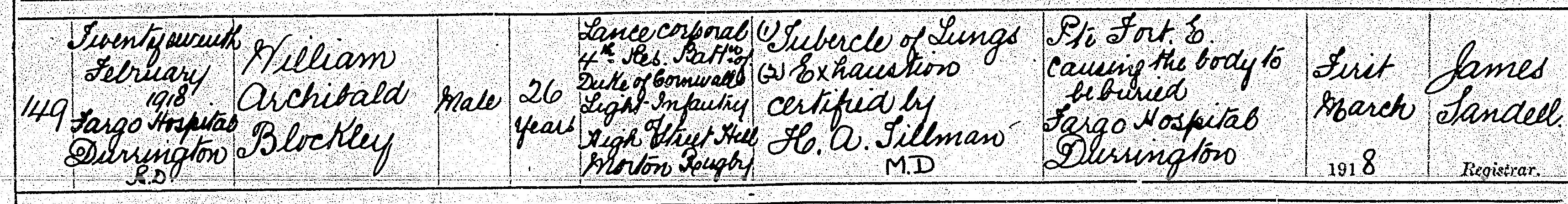 William died on 27 Feb 1918 of Tubercle of the Lung and Exhaustion, aggravated by military service, at Fargo Military Hospital, Durrington, Amesbury (near Salibury Plain. William's death certificate is attached below.