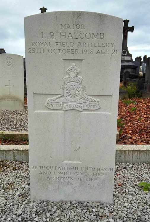 Maj Halcomb is listed as being killed in action on 25 Oct 1918. The 295th Brigade was diary entry for the period 23rd to 31st Oct is transcribed below. Hem - Oct - 23rd to 31st: Ordinary routine work. All ranks in billets. Routes reconnoitred in case of further advance, also positions to cross Battle Line. On 25th Major T.C. Carlyon DSO, RFA left to take over command of 71st Bde. Major W.P. Akerman DSO again in command. Major L.B. Halcomb B/295 was killed on 25th inst when out reconnoitring. His death is much regretted by all ranks in this Bde. Halcomb came up as Capt of B/64? when the Division came to France and was a most popular and capable officer. |