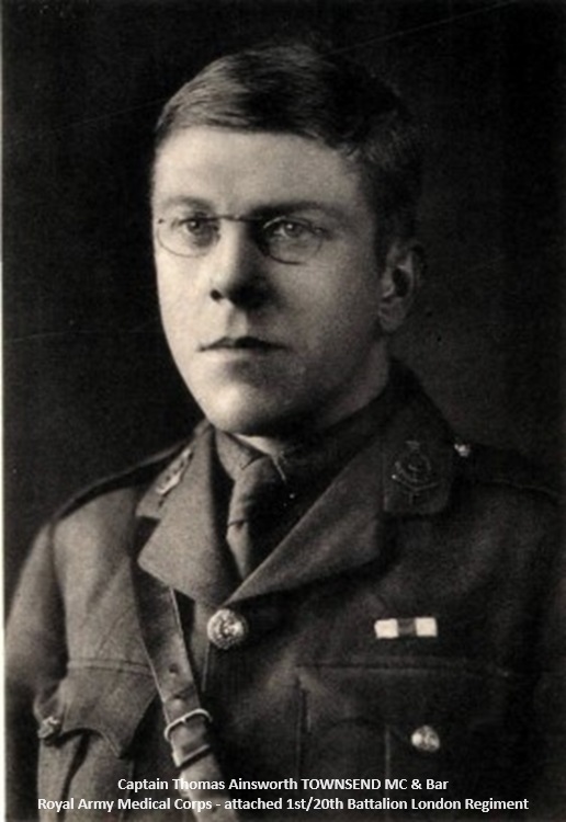 Medals and Awards25 Nov 1916 - Awarded the Military Cross - (Gazette) 18 Jul Nov 1918 - Posthumously Awarded the Bar to His Military Cross - (Gazette) Citation: Captain Thomas Ainsworth Townsend, Royal Army Medical Corps. "For most conspicuous gallantry and devotion to duty. Although twice wounded he refused to have his wound attended to, and continued to dress the wounded (under & continuous and heavy concentration of high-explosive and gas shells. Not only did he attend the wounded and gassed of his own unit but rendered aid, under conditions of great difficulty, to wounded of neighbouring battalions, whojse. medical officers had become casualties. His complete disregard of personal danger and splendid devotion were a magnificent example to all". 1st/20th Bn War Diary24.3.18 – North of Rocquigny – Ecquancourt Road: Early morning, enemy was seen advancing over Lechelle Ridge in large numbers but range too far for our L.G.s [Lewis Guns]. They advanced into sunken ground between us and Lechelle, unfortunately we could not get any artillery on to them and they were therefore able to reform there and to work round close up to 19th and enfiladed and trench mortared them. 19th were forced to retire and 18th with them leaving our right flank exposed. We decided to hang as long as possible and our D Coy formed defensive flank on right manning both sides of trench. Enemy at this point had got into part of village of Rocquigny and were firing into our rear. As position was serious C.O. saw C.O. of 12th Manchester who were on our left and both decided to support each other to the last. About this time 3 tanks advanced from Manchester’s front and temporarily checked enemy with their M.G. fire, causing many of them to run back. Tanks returned however and enemy then advanced in large numbers on Manchesters causing them suddenly to retire, which left us isolated. The C.O. therefore gave orders for Battn to withdraw to Beaulencourt which proved a very difficult operation as enemy were on three sides of us and close up to us. C.O. stayed to see last of Battalion out and was apparently captured. Battalion suffered heavy losses during withdrawal and a few reached Beaulencourt but found no line there. No detailed account of operations from this point can be given as whole Brigade was necessarily scattered. The survivors collected at High Wood and held a line there that night. 25.3.18 – Contal Maison: At 3am remains of Brigade withdraw to Contal Maison. Major W.B. Vince DSO, MC (1/8th London) took over command. 26.3.18 – Millencourt: Relived by 12th Division and formed up at Millencourt. During afternoon Division trecked back. This Battalion trecked to and was billeted in, Vauchelles. Letters to Family and TributesLetters were received from those who had been eye-witnesses of Captain Townsend's courage and devotion, and agreed with remarkable Some sailors were visiting the trenches at the time when the Hairpin Trench near Ypres was blown up, and their A Doctor wrote: "An old Guy's man, a Regimental M.O., said to me last year at Poperinghe, 'Townsend is, in my mind,the bravest man in the British Army.' Another letter said: "I have found two men who knew your son very well in France. Both say that he was one of the bravest men in France, and one who never thought of himself, but only of others. He defied and scorned danger of any kind, and inspired everyone by his splendid bravery." A stretcher-bearer wrote: " He was an exceptionally brave man and a grand example for many. From the moment of the onslaught Captain Townsend worked most nobly and brilliantly. Previously to his having been wounded he was seen to perform a most conspicuous act of gallantry in face of the enemy. In Bourlon Wood he worked unceasingly under awful conditions. I never was able to understand how ever he managed to escape being gassed. No greater man ever attended the wounded and dying, as did he on that never-to-be-forgotten occasion." |