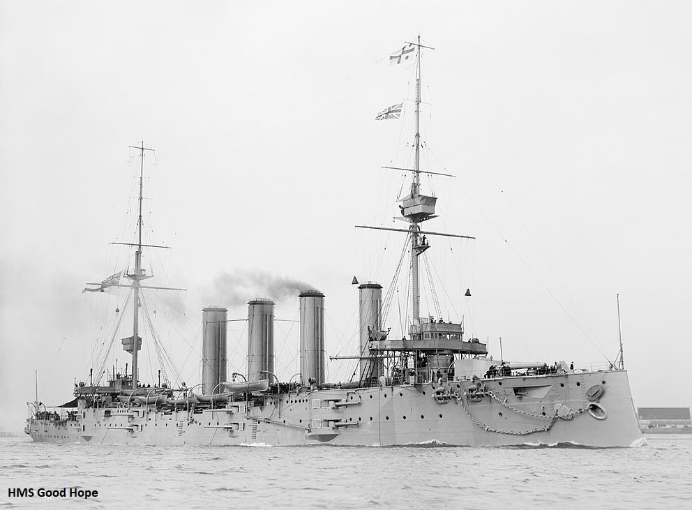 Spee immediately turned to close and signalled his ships to open fire at 19:04 when the range closed to 12,300 yards and Spee's flagship, Scharnhorst, engaged Good Hope while Gneisenau fired at Monmouth. Cradock's flagship was hit on the Scharnhorst's third salvo, when shells knocked out her forward 9.2-inch turret and set her forecastle on fire. Cradock, knowing his only chance was to close the range, continued to do so despite the battering that Spee's ships inflicted. By 19:23 the range was almost half of that when the battle began and the British ships bore onwards. Spee tried to open the range, fearing a torpedo attack, but the British were only 5,500 yards (5,000 m) away at 19:35. Seven minutes later, Good Hope charged directly at the German ships, although they dodged out of her way. Spee ordered his armoured cruisers to concentrate their fire on the British flagship and she soon drifted to a halt with her topsides all aflame. At 19:50 her forward magazine exploded, severing the bow from the rest of the ship, and she later sank in the darkness. Spee estimated that his flagship had made 35 hits on Good Hope, suffering only two hits in return that did no significant damage and failed even to wound one crewman.[21]Good Hope was sunk with all hands, a total of 926 officers and ratings. © Wikepedia