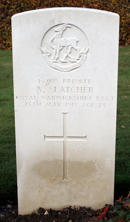 Alfred is listed as dying of wounds on 15 May 1918 and he was buried at Lapugnoy Cemetery. At that time Lapugnoy was being used by fighting units to bury their dead and so it is likely he died on the same day he was wounded. The 1st Battalion's Detailed Statement of Casualties shows that on the 13th May 2 Other Ranks were killed, on the 14th May there were no casualties and on the 15th May 2 Other Ranks were killed and 5 more were wounded.CWGC records show that 1 of the 2 OR killed on the 13th was buried at nearby Mont-Bernanchon Cemetery and the 2 OR killed on the 15th were again buried at Mont-Bernanchon Cemetery which is close to the trenches as Le Cauroy with Lapugnoy being further south. The 1st Battalion war diary for the period 13th to 15th May is transcribed below. Trenches near Le Cauroy - May 13th 1918: Dull day, cold, windy and wet. At about 2am Hostile artillery shells Canal Bank & SE end of Pacaut Wood with 5.9’s and 4.25”, about 200 shells altogether. From 9am till 12.30pm enemy shells area round Bellerive & Lannoy very heavily with 5.9’s. G.O.C. 4th Division visits Battalion HQ during the morning. Hostile artillery continues fairly active on back areas during afternoon. Fairly quiet night. 2nd Lieut FN Martin rejoins from Hospital. Trenches near Le Cauroy - May 14th 1918: Fine sunny day. Enemy has about 10 Observation Balloons up during the day. Enemy artillery is less than normal. The C.O. and Coy Officers of the 1st Rifle Brigade come up to Battalion HQ during the day to look round the line prior to taking over. Very quiet day indeed. Our artillery carry out harassing fire at night especially from 12.30pm till about 2am as a hostile relief is believed to be taking place. Enemy retaliation fairly heavily on area round wood & both banks of Canal. C Coy have a Lewis Gun knocked out. Remained of night quiet. 2nd Lieut F.J. Marks to England sick. Trenches near Le Cauroy - May 15th 1918: Fine sunny day. Enemy has about 12 Observation Balloons up during the morning. Very quiet in the front areas during most of the day, the enemy being confined chiefly to shelling batteries in the afternoon. We are relieved at night by the 1st Rifle Brigade & Coys marched back to billets at Busnettes arriving there about 1am. Relief complete about 11.25pm. No casualties coming out. 2nd Lieut's Gleave, Adams and Torrie K.S.L.I join the Battalion. |