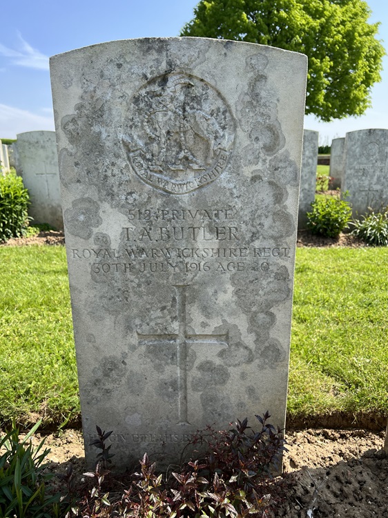 Thomas is listed as being killed in action on 30 Jul 1916. The 16th Battalion war diary for that day is transcribed below and suggests he was killed in the early hours of 31 Jul 1916. Pommiers Redoubt – 1916 30 July: Bn received orders that 13th I.B. [Infantry Brigade] were attacking and consolidating the line approx from Delville Wood S.11.d.8.5 to S.11.d.27.85 – S.11.c.55.85 – thence NW towards High Wood as far north as S.11.a.3.2. XIII and III Corps were attacking on right in conjunction with the French, 51st Division were attacking on the the left. The Bn & the 1/Bedfords were detailed to be in Divisional Reserve and were prepared to move at short notice from 6pm. 9.40pm: The Bn received orders to move off and report to 13th I.B to find out the situation and come under their orders. The situation was as follows: 51st Division had taken their objective but had been driven out and were on their original line. The Bn was to move up into the German second line trench from S.16.a.5.6 to S.16.b.8.1. 12am: Bn HQ in position about S.16.b.2.4 in German second line trench. 12.30am [31 July]: All Coys in position in German trench & commenced to dig themselves in. 3.00am: The enemy put up a barrage along German second line trench. Casualties: Wounded 1 officer. Killed 8 Other Ranks by shell fire. |