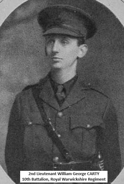 William is listed as being killed in action on 25 Mar 1916. The 10th Battalion war diary entry for that day is transcribed below. Trenches - Chapigny - 25/3/1916 Saturday: Staff Captain and Brigade Major visited trenches with the C.O. at 10.30am. C.O. again visted at 5.30pm. Enemy shelled front line trenches and Tilleloy (N) Post very heavily. 12 men went on leave. Casualties: 2nd Lt W.G. Carty killed; [Other Ranks] 4 killed and 6 wounded. |
