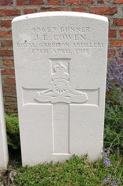 John is listed as being killed in action on 27 April 1918. The 59th Brigade, RGA war diary entries for the 25th, 26th along with the 25th Brigade entries for 26th and 27th are transcribed below as 30th Siege Battery moved from 59th to the 25th Brigade on 26th April. 59th Brigade - Field - 1918 April 25: Heavy shelling of battery positions on the Canal Bank. 350 SB [Siege Battery) has one gun knocked out during the evening. Enemy attacked on our right and captured Kemmel Hill. 59th Brigade - Field - 1918 April 26: 30 SB ordered to pull out & proceed at once to Esquelbecq under administration of 25th Brigade RGA 37, 335 & 350 SB ordered to pull out one section and get into the action on the Red Line Position. 350 SB subsequently pulled out remaining section. 335 SB were badly shelled on Canal Bank during the move, 1 man being killed and 4 wounded. 25th Brigade - Esquelbecq - 26:4:1918: (see above) 11 R.M.A and 375 Siege Battery move from Wormhordt to Schipstadt near Millain (Nord) to clear the former town. 25th Brigade - Esquelbecq - 27:4:1918: (see above) 12 R.M.A. leave for IX Corps H.A. (Abeele District). 21, 30, 90, 152, 191 & 286 Siege Batteries return (consequent upon the taking of Kemmel ?) parking this time along the Zeggers - Cappel - Bissezeele Road. |