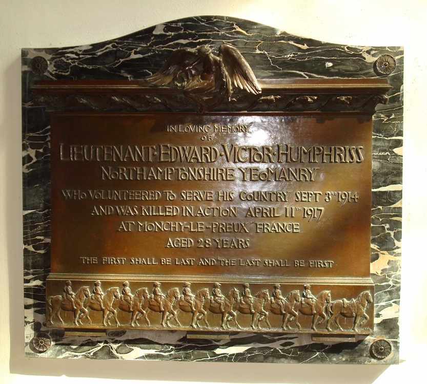 Edward is listed as being killed in action on 11 Apr 1917. The 1st/1st Yeomanry war diary entry for that day is transcribed below. April 11th 1917 – In the Field - Monchy-le-Preux: The orders were to proceed at dawn to the dead ground W of Orange Hill, to follow up the attack of the 37th Division on Monchy & then seize and hold the line Boiry Notre Dame to the River Scarpe at I.22 central. The 3rd Cavl Division had also orders to go through in front of the Regt. At 7.30am Monchy was taken by the Infantry, the 8th Cav Brigade advanced through heavy artillery barrage followed by this Regiment. On arriving in Monchy it was found the 8th Cav Bde had been unable to get on owing to Machine Gun fire. A Squadron under Major Manning went into action dismounted at SE end of the village on road to Pelves but the other 2 Squadrons got blocked by the led horses of the 8th Cav Bde. As the village was under shell fire B & C Squadrons were given orders to retire which they did to Orange Hill & shortly afterwards A Squadron were given similar orders as it was found that they were not required in the defence of the village. Lt. Col Seymour was slightly wounded and Major Sir G.B. Lowther assumed command. As the enemy had brought up its reserves and there was then no chance of getting on, the Regt was ordered to bivouac for the night at Railway Triangle & next day to return to billets. Casualties this day were Killed 2/Lt J Goodman & 2/Lt E.V. Humphriss. The diary then names all the casualties, both officers and other ranks. Due to time constraints we have not listed them. The war diary can be ordered from the National Archives under reference WO-95-792-2. |