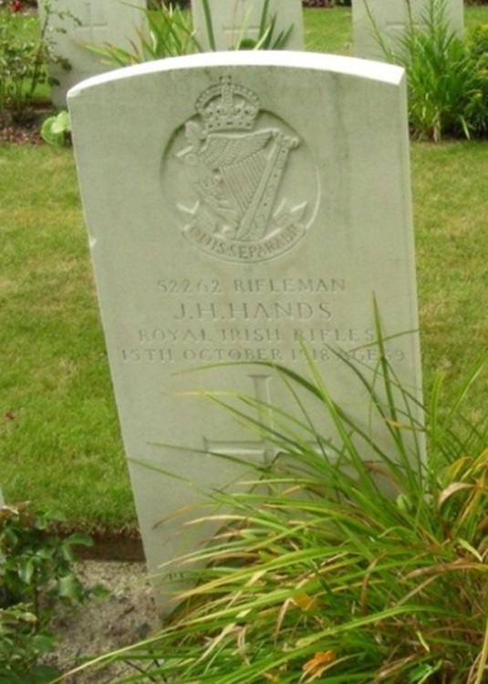 John is listed as being killed in action on 15th October 1918. The 1st Battalion war diary entries for the 14th, 15th & 16th October are transcribed below Support 14th October 1918: The Bn passed through the 15th Bn E of Moorseele and attacked Gulleghem without artillery support and was held up by 3 belts of barbed wire and heavy machine gun opposition about 500 yards west of Gulleghem Line 1700: Bn again attacked Gulleghem attempting an outflanking movement but only progressed about 200 yards. With rifle fire we bought down a German reconnaissance machine and captured the Aviators (One Officer and one NCO) Casualties: Line near Gulleghem - 15th October 1918: The Battalion again attacked (with artillery barrage) Gulleghem and reached objective 1000 yards E of Gulleghem where the 2nd Bn passed through our Bn and reached line of Corps objective (Heule). A gap occurred between 2nd Bn on the right and 9th Division on the left and was filled up by our Battalion thus bringing it into the front line again. Casualties: 2/Lt W.C. Whelan took over the duties of Acting Adjutant since Capt & Adjutant J.C. Leeper wounded and Lieut W.C. Gardiner took over the duties of the asst Adjutant. Line near Gulleghem - 16th October 1918: The Battn was relieved by the 9th Division on the right and the 2nd Bn R. I. Rifles on the left and moved into billets at Rollinghem Cappel where the Bn Transport rejoined the Battalion. Casualties: Bn captured between the 14th and 16th one Howitzer |