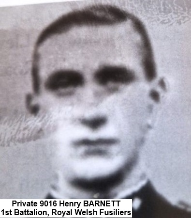 Henry (Harry) is listed as being killed in action on 19th October 1914 during the Attack of Kleythoek. The following is taken from the Battalion History courtesy of a user on the Great War Forum. There was not much action for the 1/RWF on the 6-9th October 1914, they travelled from Dover to Seebrugge (5-6th), arrived Belgium and moved to billets in Oostcamp 4 miles SE Bruges (7th). Marched to Oudenburg on the 8th. On the 9th they moved again to Ghent with German forces reported within 10 miles of the town. At this point no contact with the enemy was recorded. On Oct 10th 1914 the 22nd Brigade which included the 1/RWF Bttn moved South at 2:30 am from Ghent in Belgium to Meirelbeke. This was done to support Belgium and French troops that were in contact with the German troops. They encountered no signs of any enemy during the morning, but heard some firing in the distance to the South and South East. In the Afternoon the 1/RWF located itself in a pre-entrenched position South East of Meirelbeke covering French and Belgian positions in front. Heavy firing during the night believed to be cheifly from the French and Belgians. No evidence of any attacks by the Germans. 1/RWF not engaged but a few shots came over the position. Between 11th October and 16th October 1914 the general retirement by allied forces commenced to Ypres region and the 1RWF was finally positioned at Zonnebeke by the morning of the 17th October. On the 18th the 1/RWF Bttn moved again to Veldhoek and Becelaere. Finally on the 19th October 1914 the first offensive action by the 7th Division (including 22nd Brigade and 1/RWF) on enemy positions took place at Menin, Gheluwe and Kleythoek.The 1/RWF attacked at Kleythoek towards the ridge and windmill, but was frustrated by heavy enemy artillery and shrapnel. There was no support from friendly artillery and by 12:40 pm orders were recieved to withdraw. The 1/RWF retired along the main road to Dadizeele. Here together with the R Warwicks they were ordered to hold the high ground about Kezelberg and cover the retirement of the Queens and S Staffs. Eventaully the R Warwicks finally covered the retreat of the 1/RWF with the Bttn being closely engaged with the enemy and suffered losses as the retirement was extremely difficult to pull off. Eventually the 1/RWF reached the safety of the trenches originally occupied on the 16th/17th October at Zonnebeke at 6pm. Casualties on 19th October 1914: Killed :3 Officers, 15 NCO's and Men, Wounded:4 Officers, 84 NCO's and Men. Missing :11 NCO's and Men. |