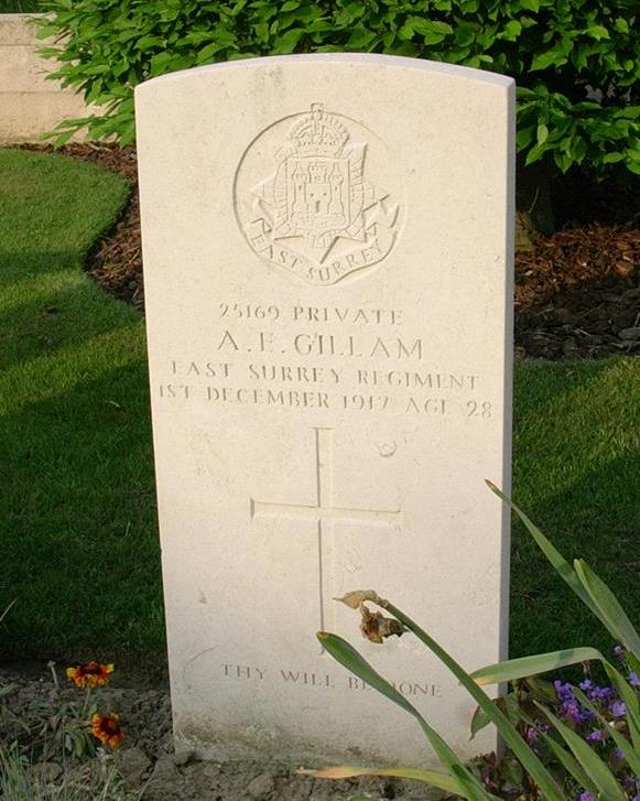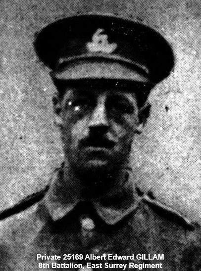 News is to hand of an unofficial character that another Kenilworth soldier has died in the service of this country. We refer to Private Albert Edward Gillam of the East Surrey Regiment (who before joining up lived with his wife and baby child at 33 Mill End, Kenilworth. Private Gillam was a smart, well set-up soldier who was wounded in France several months ago and had only been back at the front about 5 months prior to his death.
