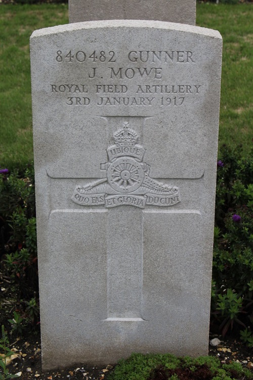 Jesse died of wounds at a Military Hospital in Rouen having been wounded by enemy shelling on 8th December 1916. The 307th Brigade war diary entry for that day is transcribed below. 57d.R.34.d.5.7 [N of Pozieres] – Dec 8th 1916: During the morning the Dump at Tullocks Corner and Battery position of D/307 was heavily shelled causing several casualties. It was therefore decided to move the Battery into an unoccupied position at R.34.c.7.0. Major Torrens commanding the Battery [D] was unfortunately killed. |