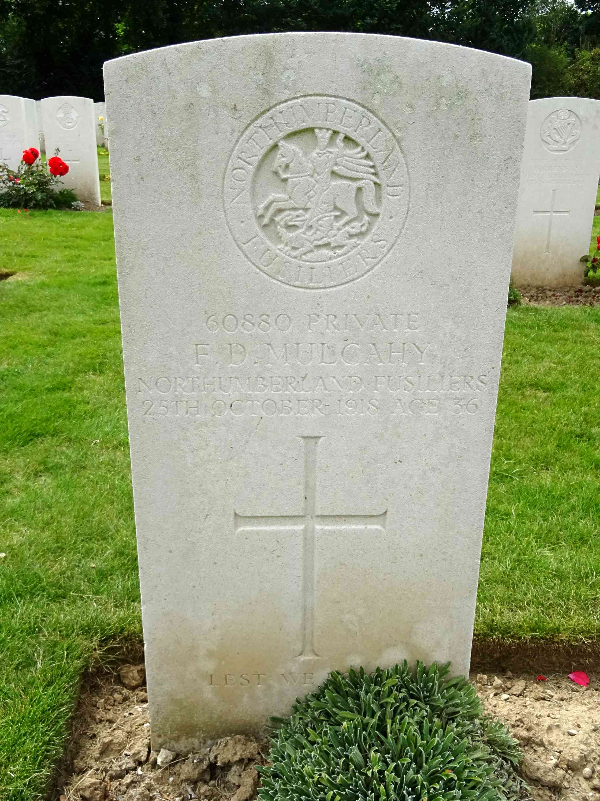 Frederick is listed as dying of wounds on 25th October 1918 at the 59th Casualty Clearing Station near Cambrai. The 12th/13th Battalion war diary shows that Frederick would have been wounded on the previous day, 24th October 1918, and the war diary entries for the periond 18th to 25th are transcribed below. Walincourt – 18/10/18: Training & re-organising Walincourt – 19/10/18: Training & re-organising Walincourt – 20/10/18: Church Parade Walincourt – 21/10/18: Inspection of ammunition, rations, respirators, feet etc. Strength 39 Officers and 808 Other Ranks Walincourt – 22/10/18: Battalion moved up to Inchy Inchy - 23/10/18: Division attacked at 04.00 hours. The Battalion was moved from Inchy at 05.00 hours and went into Divisional Reserve west of Amerval. We followed up during the day as far as Vendegies. Vendegies - 24/10/18: The Brigade attacked at 04.00 hrs. The Battalion passed through the 1st Bn Lincolnshire Regt at 06.00 hours & continued the attack. The 64th Brigade on our right being held up, C Coy on our right flank could not get forward. Battalion attacked again at 16.00hrs & gained objective (X.11.a to X.17.d). Casualties: 2/Lts B A Watson, O Tunnell & J Greenwick killed, 2/Lts Spooner, Chatt & Anderson wounded. 13 OR killed, 100 OR wounded & 30 OR missing. Vendegies - 25/10/18: Brigade relieved by 110th Brigade. The Battalion moved to sunken road at 3A & 2B. |
