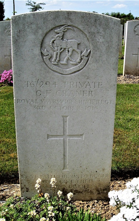 George is listed as dying of wounds on 3rd October 1916 at one of the three, No.3 BRCS, No.5 and No.2 Stationary Hospitals that were based in Abbeville. We have not been able to identify exactly when and where George was wounded.