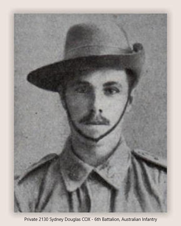 Sydney is listed as being killed in action on May 8th 1915. The 6th Battalion war diary actually starts on 8th May 1915 and the entries for the period 8th to 10th are transcribed below. Click here to read the whole 6th Battalion war diary. Near Krithia - 8.5.1915: The Battalion, strength 22 officers and 703 other ranks was bivouacked during morning at [left blank]. At 11.30 am, the Brigade moved in Artillery Formation, 6th Battalion leading to 176. W. 1-4 where the Battalion dug [in] and occupied dug outs, acting as support to firing line. Here there were a few casualties from stray bullets At 5.20pm an order was received from Brigade HQ to attack enemy trenches with left resting on creek, left of which would be New Zealand Brigade and right about 500 yards east of creek, the line being extended by 7th Battalion. The Battalion was to be in position ready to advance at 5.30pm. — Objective — Hill in rear of Krithia A Coy was on left and C Coy on right, with supports – A on left, B on right. At 5.30pm the advance commenced under very heavy shrapnel, rifle, and Machine Gun fire, was pushed on, under verbal orders of Brigadier, losses were heavy especially among officers. The original firing line occupied by Fusiliers was passed and a new line occupied about 100 yards from enemy trenches, about 600 yards in advance of original firing line. The advance was not covered by Artillery or rifle fire. Here a trench was dug during the night. The firing line of the Bde was 1200 yards long and was under control of Major H.D. Bennett, 6th Battalion. The supports were entrenched about 150 yards in rear and were under Lieut. Col. Weiss 5th Battalion. The New Zealand Brigade were on the left and Naval Division on the right did not come up during the night. Near Krithia - 9.5.1915: Trenches were improved. A difficulty was experienced in obtaining supplies owing to lack of communications to the rear. The creek on left flank was used for bringing up supplies which were passed down firing line – 1200 yards. Water was obtained by sinking holes in trench Enemy made no attempt to counter-attack. Sharp shooters were at first a trouble, but these were held down by our sharp shooters. Near Krithia - 10.5.1915: Trench further improved wire (loose) entanglement was made up the creek on our left and on our right. Latrines were dug |