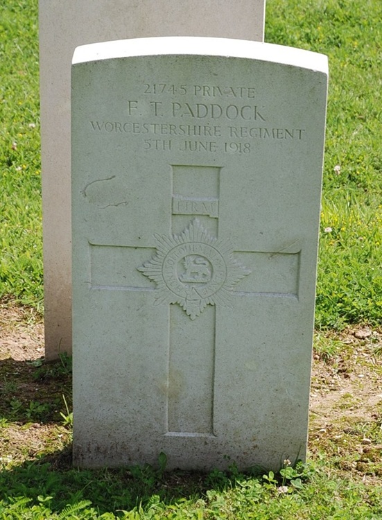 Frederick was officially reported missing in action on the 27th May 1918 at Berry au Boc. Red Cross records [click here] reveal that Frederick died on 5th June 1918 in as a result of a gunshot wound to the lung and was he buried in the cemetery in Asfeld-la-Ville and later his remains were moved to the Rethel French National Cemetery. The 1st Battalion war diary entries for the period 26th to 28th May and a newspaper obituary are transcribed below. War Diary 26th to 28th May 1918Berry au Boc - 26.5.1918: Battalion in line, attitude of enemy very quiet, 2 Coys relieved by 25th Brigade. Berry au Boc - 27.5.1918: Enemy’s barrage opened at 1am and as far as can be ascertained attacked at 4am. At 11am Col. Davidge took up a line between Roussy & Boufignereux with Lewis Gunners of 24th and 25th Infantry Brigade and all stragglers of the Battalion. The line was forced to retire and successive line was taken up on the high ground N of Montigny N of Montigny – 28.5.1918: The left flank was forced back and the line withdrew at about 9.30am to Joncherry. This line was held till the afternoon when a withdrawal to the N of Branscourt was made. Subsequently a line was held on high ground south of that village but owing to the left flank being forced back a further withdrawal to the reverse side of the hill was made, here the French 419th Regiment reinforced the line. Stratford Herald ObituaryStratford Herald - Friday 14th February 1919 Last summer Mrs. Paddock of 45, Ely Street was notified that her eldest son was posted as missing and a little later a Non-Commissioned Office wrote to the widowed mother stating that he had been severely wounded and taken prisoner of war on May 27th. Mrs. Paddock learnt nothing further in that respect until Private Frederick Thomas Paddock who was 20 years of age was formerly employed by Mr. George Whateley. He joined the Worcesters in March 1915 and had seen 18 months service in France. |