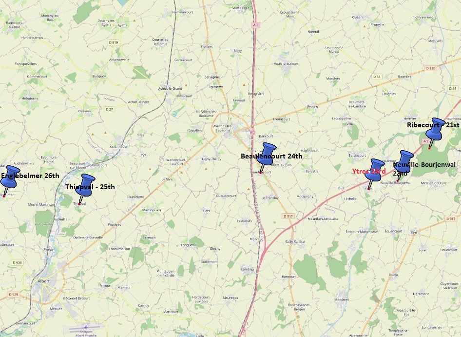 It is not known on what day William was wounded as the diary is not specific but the battalion were on the front lines at Ribecourt when the German Spring Offensive began on March 21st and they had to fight a rearguard action by falling back to Neuville on the 21st, Beaulencourt on the 22nd, Ytres on the 23rd, High Wood via Flers on the 24th, Thiepval on the 25th and finally Engelbelner on the 26th when the retirement stopped. William died of his wounds at one of the two Stationary Hospitals at Doullens.| Personal & Family History |