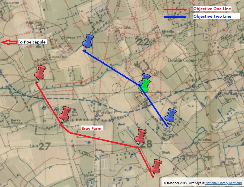 NB: The Operational Order 91 gives the map references for the objectives but not the start points. It is believed that George was killed in the attack on Bray Farm which was part of the 1st objective - see map below. Click to enlarge