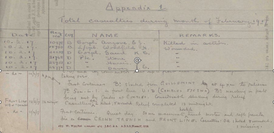 The war diary shows that Hubert was wounded on the 10th Feb 917 when the battalion were in Front Line & Crown trenches close to Combles and on the 10th the battalion had moved from Guillemont to relieve 7th Somerset Light Infantry in those trenches. There was a heavy bombardment during the relief operation which caused Hubert's wounds.Grove Town Cemetery was used by the 34th and 2/2nd London Casualty Clearing Stations and so Hubert would have died at one of those places.