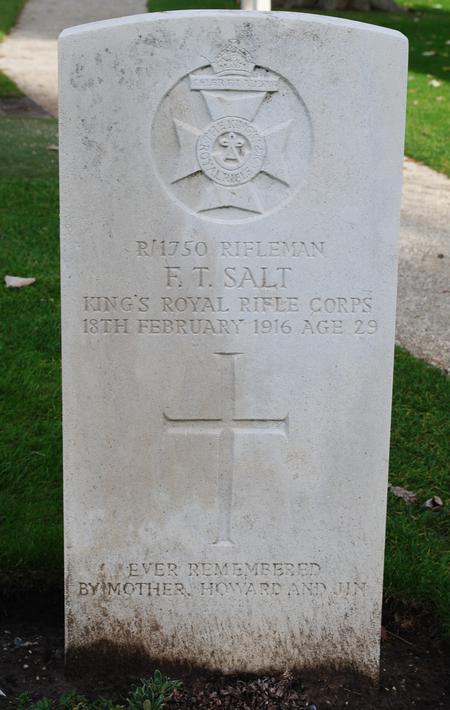 Frederick is listed by the CWGC as being killed in action on 18 Sep 1916, however his Grave Registration document on the CWGC gives the date of death as 17 Sep 1916. The war diary entries for that period are all very brief and the period 16th to 19th inclusive is transcribed below. Canal Bank E of Poperinghe - 16-2-16: No entry made in diary 17-2-16: Battalion relieved 11 K.R.R.C in trenches. The relief was longer than usual owing to bright moonlight. No casualties. 18-2-16: Enemy on the whole quiet, except for worrying M.G. fire at night. 19-2-16: Enemy's artillery active, about mid-day & continued so until dusk but little damage done. At 4.28pm an S.O.S was received from F34. END |