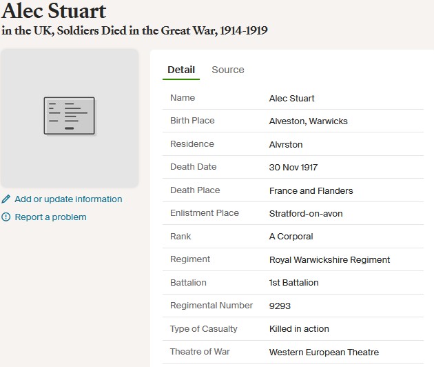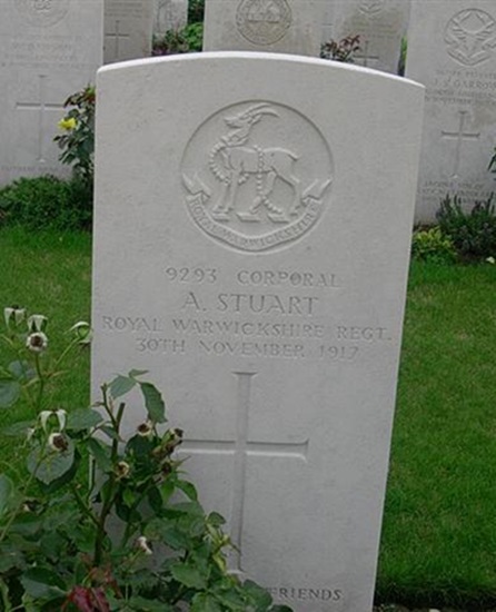 Alec's birth was registered as Alec Stuart Franklin but he enlisted as Alec Stuart. Franklin was his mothers last name. We were unable to find his father and we know that Alec was an "illegitimate" child. His next of kin in Army records is his Aunt Maud M. Franklin and his CWGC Headstone (see below) was organised by Mr. R.J Franklin of Perry View, Alveston.