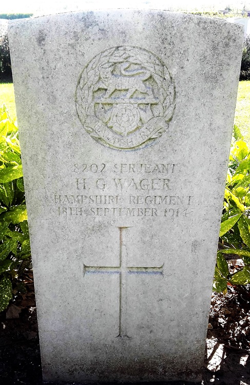 Hubert is listed as being killed in action on 18 Sep 1914. He was originally buried at Soissons Communal Cemetery before his remains were exhumed around 1920 and, having been identified by his uniform, he was reburied at Vaixbuin. The 1st Battalion war diary does not list any deaths on the day he is said to have been killed nor on the day after, however in the period 13th to 17th it lists 11 other ranks as being killed. The battalion war diary entries for the period 13th to 18th Sept 1914 are transcribed below. 13th to 17th Sept - La Montagne Farm: Still occupying trenches at La Montagne Farm. During which time were more or less continuously under artillery fire & wet weather made the conditions in the trenches very trying. On the 16th the enemy brought up his heavy guns (reported to be 8.5in mortar). These were used in conjunction with aircraft for observation with amazing accuracy and caused a good deal of loss in our trenches. On this date units from the 10th Infantry Brigade were brought up into the firing line and two sections organised each consisting of units from both Brigades. The Hampshire Regt coming under command of Brig Gen Haldane Commanding 10th Infantry Brigade. 11.30am till 1.30pm 17th Sept: Bucy-le- Long heavily shelled by enemy’s heavy guns which caused considerable damage. Casualties 13th to 17th: Killed: Officers Nil and Other Ranks 11 18th Sept - La Montagne Farm: Orders received to sort our the two Brigades 10th Bde of the right as far as a point 150 yards west of La Montagne Farm. 11th Bde thence to the left occupying a frontage of about 1500 yards with its left resting on the right of the 45th French Division (African). The Bn was supposed as follows: 2 companies in fire trenches, 1 company in supporting trench and 1 Company held in reserve in a conveniently situated cave. Casualties: Wounded - Officers Nil & Other Ranks 1. |