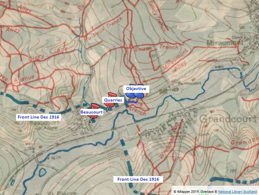 Overnight of the 4th/5th February 1917 D Company were ordered to attack and clear a section of Ancre Trench between map references 57d.R.8.b.0.5 and 57d.R.8.b.3.5 however they enemy opened up an artillery barrage which forced the company to withdraw to the quarries at 57d.R.a.2.2. John was killed during this action. |