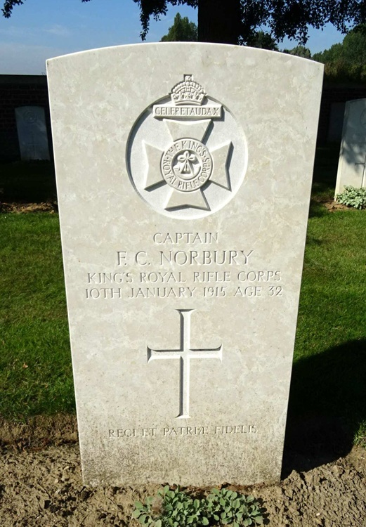 Captain Norbury at the outbreak of the war held a captain’s commission in the OTC, was gazetted captain in the Kings Royal Rifles Corps 60th Rifles on October 21st of last year and jointed the Expeditionary Force on 23rd November. To show how promising a soldier he was and how largely he was respected we make the following extract from a letter received from his commanding officer: “I cannot tell you how well and gallantly your dear boy has commanded C company of my battalion since he came out, most ably helping me to make good soldiers out nearly raw material of special reservists enlisted or embodied mostly only since the war began. A shell fell most unfortunately this afternoon, 8th January into the dug-out in which your boy was resting. To our great grief he was instantaneously killed.