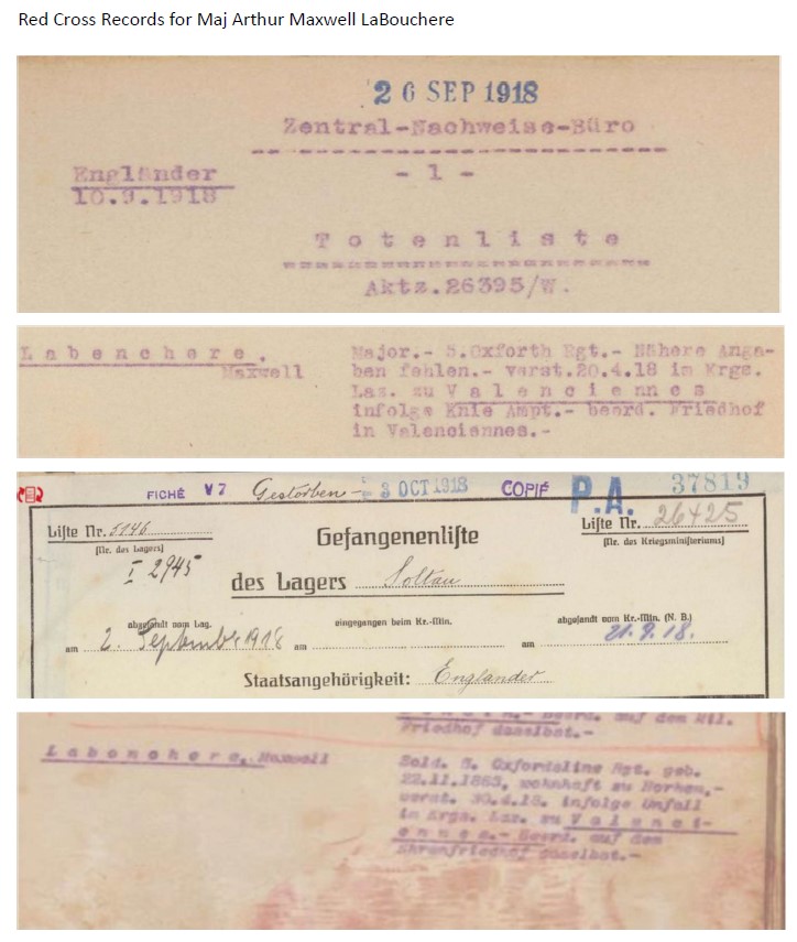 On the 3rd April 1918 the battalion marched from the area of Aubigny to Le Hamel with a three hour break at Hamelet. On the 4th April 1918 the 5th Bn were in the lines at Le Hemel when they came under attack from the enemy forcing both flanks to retire and create a defensive line south of Vaire. The war diary states that as a result of the attack Maj LaBOUCHERE was wounded and missing. In fact he had been wounded and taken prisoner and was taken to Soltau Prisoner of War (POW) Camp near Hanover where died of his wounds in the camp hospital.