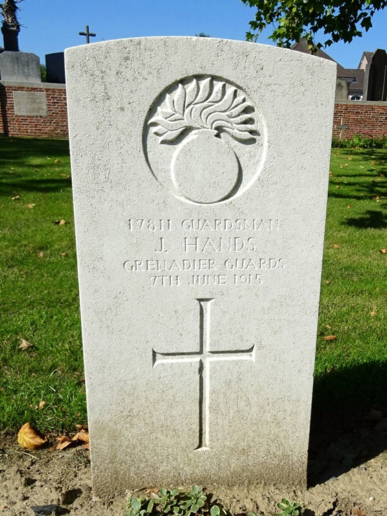 James is listed as being killed in action on 7 Jun 1915. The 2nd Battalion war diary for the 6th and 7th June shows that James actually died of wounds in the trenches at Auchy. The war diary entries are transcribed below. 6th June 1915: In billets at Noeux-les-Mines. Battalion paraded at 8.40pm and marched to Cambrin relieving in the trenches opposite Auchy (south of La Bassee Road) the 19th Battalion, London Regiment. Relief completed about 2am [on 7th]. 7th June 1915: In trenches at Auchy. Very quiet day, very hot. Trenches poor and parapets much undercut and a great deal of work required to put them in order. High Crops and long grass close up to trenches impede view. Casualties: 1 man wounded & died of wounds. |